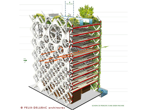 "Nos Green Machines sont aussi des usines de traitement d’air et d’eau. Les jardins bio-filtrants de la toiture et de la façade filtrent les polluants tel que le dioxyde de soufre, le monoxyde et le dioxyde de carbone et les diverses particules en suspension dus à la consommation des combustibles fossiles."Il sourit :"Les parcs ici sont verticaux, ou suspendus. Des visites pédagogiques sont organisées à l’étage des réserves d’eau si ça t’intéresse."Il installe la voiture sur une plate-forme élévatrice qui nous emmène au huitième étage où il gare sa voiture. Nous empruntons ensuite le cheminement piéton longeant la façade verte.